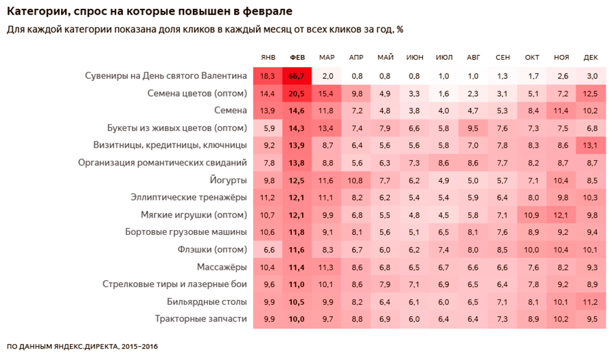 В феврале люди готовятся ко Дню святого Валентина и 23 февраля. Резко вырастает интерес к разнообразным валентинкам (от открыток до подушек и тортов в виде сердца), популярны услуги по организации романтических свиданий и, конечно, цветы. После новогодних праздников многие, видимо, начинают задумываться о фигуре, поэтому в топе категорий появляются тренажеры и йогурты. В последний зимний месяц начинает расти интерес к сельскохозяйственному оборудованию и запчастям к нему — их хотят приобрести оптом, а также к семенам цветов и овощей — здесь пользователей интересуют розничные продажи.