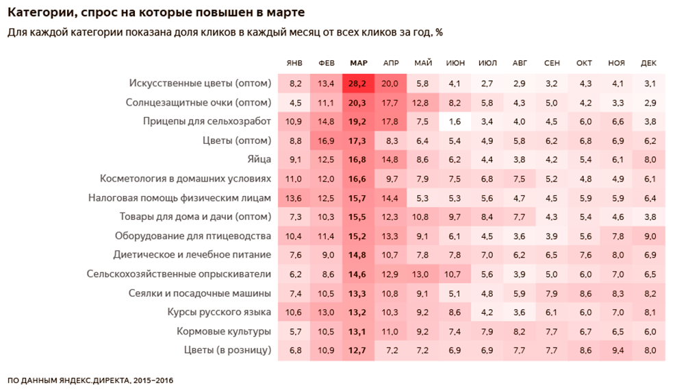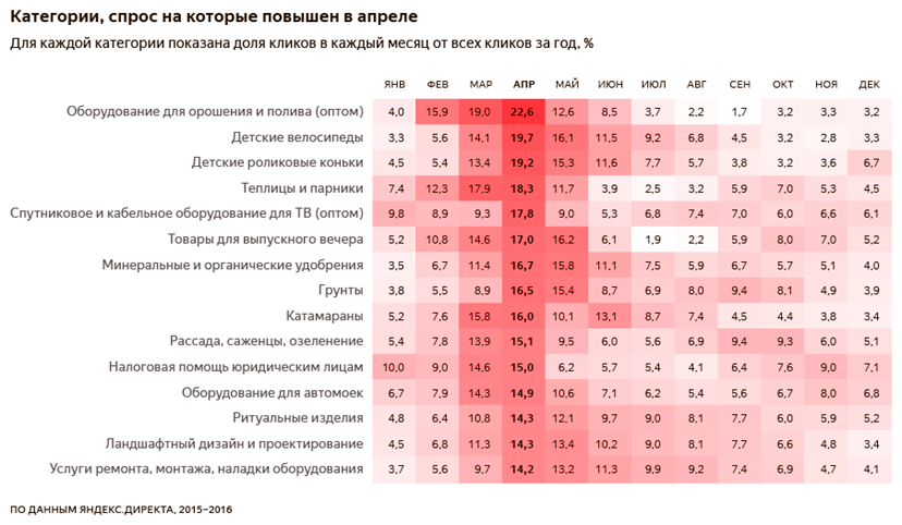 Рекламные объявления «Яндекс.Директа» видит практически вся аудитория рунета, по кликам на них можно судить об изменениях спроса на разные категории товаров и услуг. Интерес к некоторым категориям зависит от сезона и год от года изменяется похожим образом. Аналитики «Директа» изучили данные за прошлые годы и выяснили, какие категории пользовались повышенным спросом с февраля по апрель. Можно предположить, что в ближайшие пару месяцев эти товары и услуги снова будут особенно востребованы
