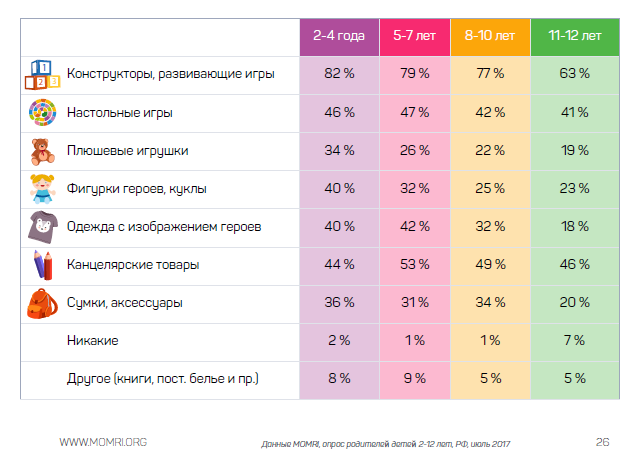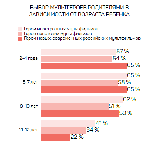 Почти каждый ребенок мечтает получить игрушку с любимым героем, говорится в исследовании. При этом 65% детей от двух до пяти лет чаще выбирают персонажей российских современных мультфильмов. Дети 8–10 лет отдают предпочтение и зарубежным героям (62%) и отечественным персонажам (59%).