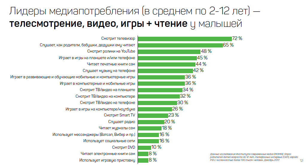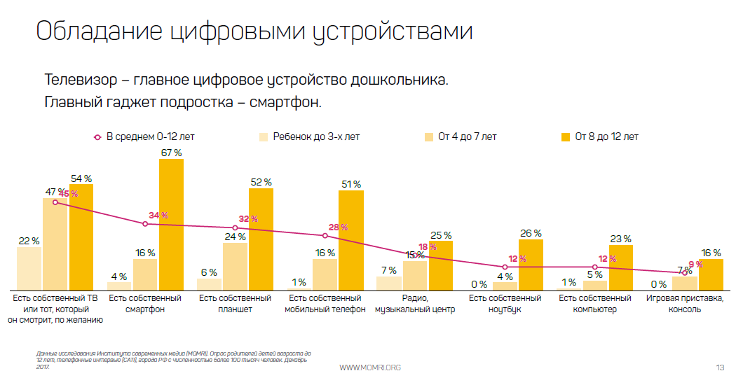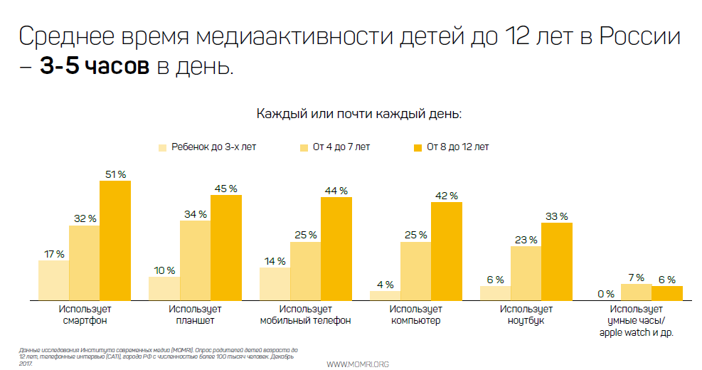 Современный ребенок активен в медиа в среднем 3–5 часов в день, рассказали директор MOMRI Кирилл Танаев и руководитель направления «Дети. Подростки. Медиа» Алена Короткова. Главные потребители контента в этой аудитории — подростки 8–12 лет. Половина из них используют смартфон, 45% — планшет, 44% — телефон (без доступа в интернет, как правило, кнопочный), 42% — компьютер, 33% — ноутбук.