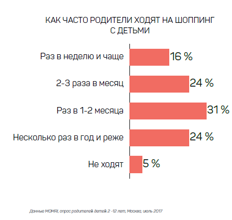 Раз в один-два месяца 31% опрошенных родителей ходят за покупками с детьми, 24% опрошенных устраивают подобный шоппинг 2–3 раза в месяц. При этом ребенок легко уговорит старших купить продукт стоимостью 300-500 руб.