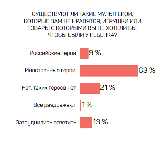 Неприязнь у 63% родителей вызывают игрушки, изображающие иностранных героев. 86% опрошенных считают, что в зарубежных мультфильмах больше насилия.