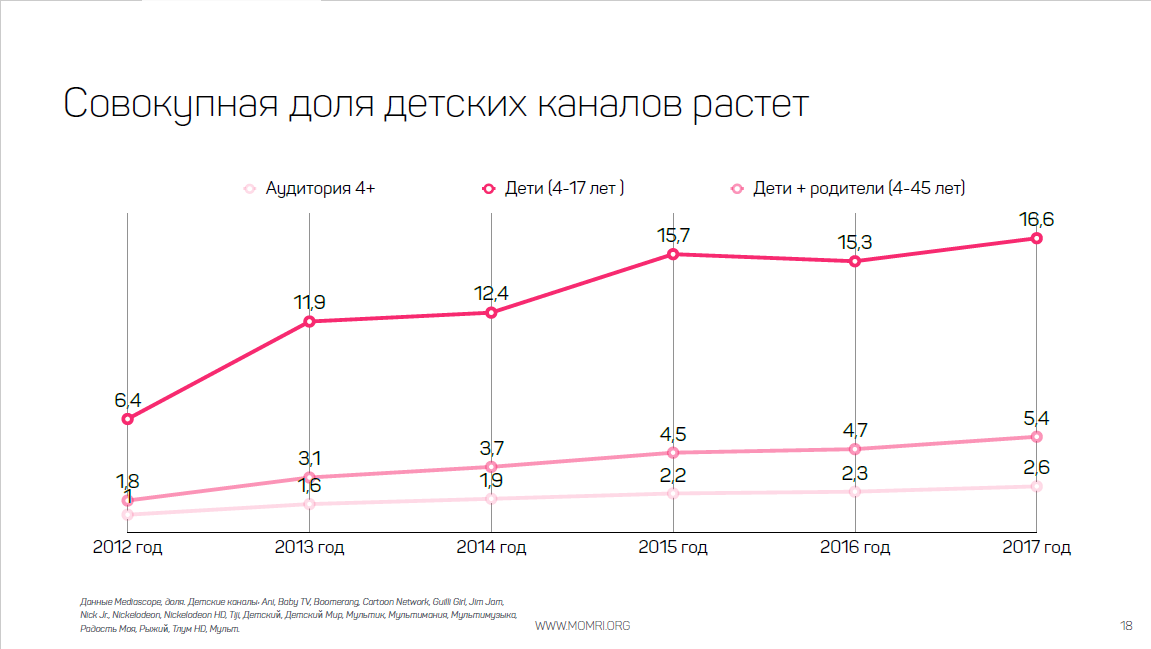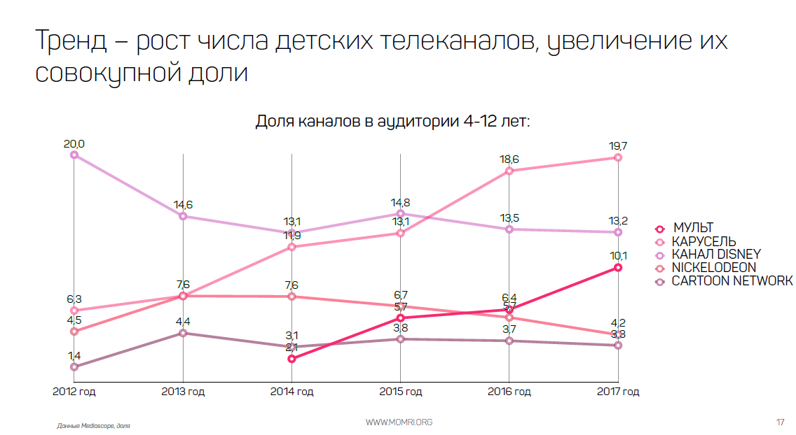 По итогам 2017 г. в топ-10 телеканалов по длительности смотрения в России вошли три детских: «Мульт», Cartoon Network, Nickelodeon