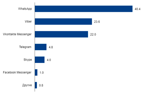 Однако установка мессенджера еще не означает его реальное использование. Действительно, данные опроса свидетельствуют, что пропорции изменились, хотя порядок расстановки остался почти неизменным.