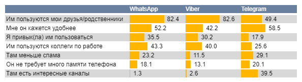 Почему люди предпочитают один мессенджер другому? Основная причина объективна: людям одного круга, например, друзьям или родственникам, нужен общий, т. е. один и тот же мессенджер. Вторая по значимости причина субъективна — это удобство самого мессенджера. А вот дальше мнения разделились. Ниже для краткости приведены данные по трем мессенджерам, входящим в пятерку лидеров.