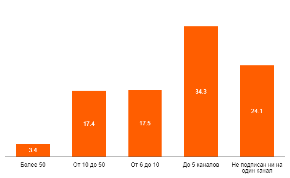 Для того чтобы оценить потенциал роста, респондентам был задан вопрос о количестве каналов, на которые они подписаны. Как видно из диаграммы, около трети респондентов подписаны на несколько (до пяти) каналов. Примерно столько же (35%) имеют более широкий круг интересов, причем половина этой аудитории (17%) — весьма широкий (10–50 каналов). Но и это еще не все: есть люди, которые подписаны более, чем на 50 каналов. Может быть, это heavy users, но, возможно, их подписная активность связана с наличием собственных каналов.