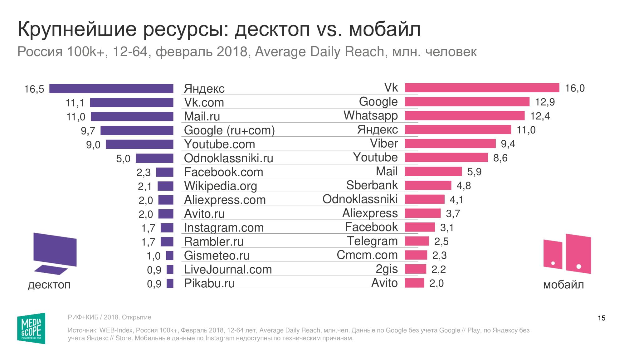 Крупнейшим интернет-ресурсом в России является «Яндекс», ежедневно в феврале туда заходили 23,7 млн человек (Россия 100k+, 12-64). На втором и третьем месте – Vk и Google.