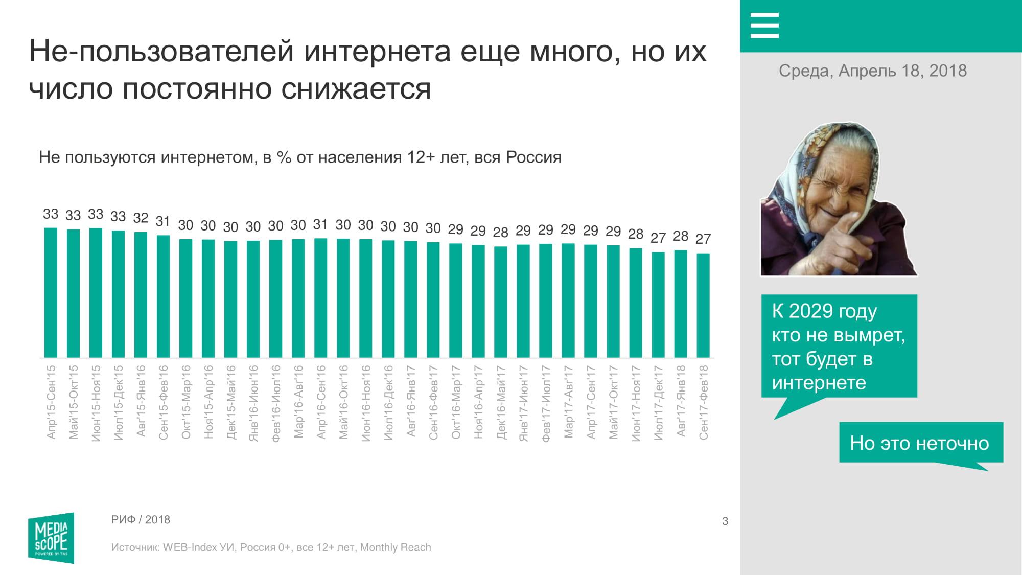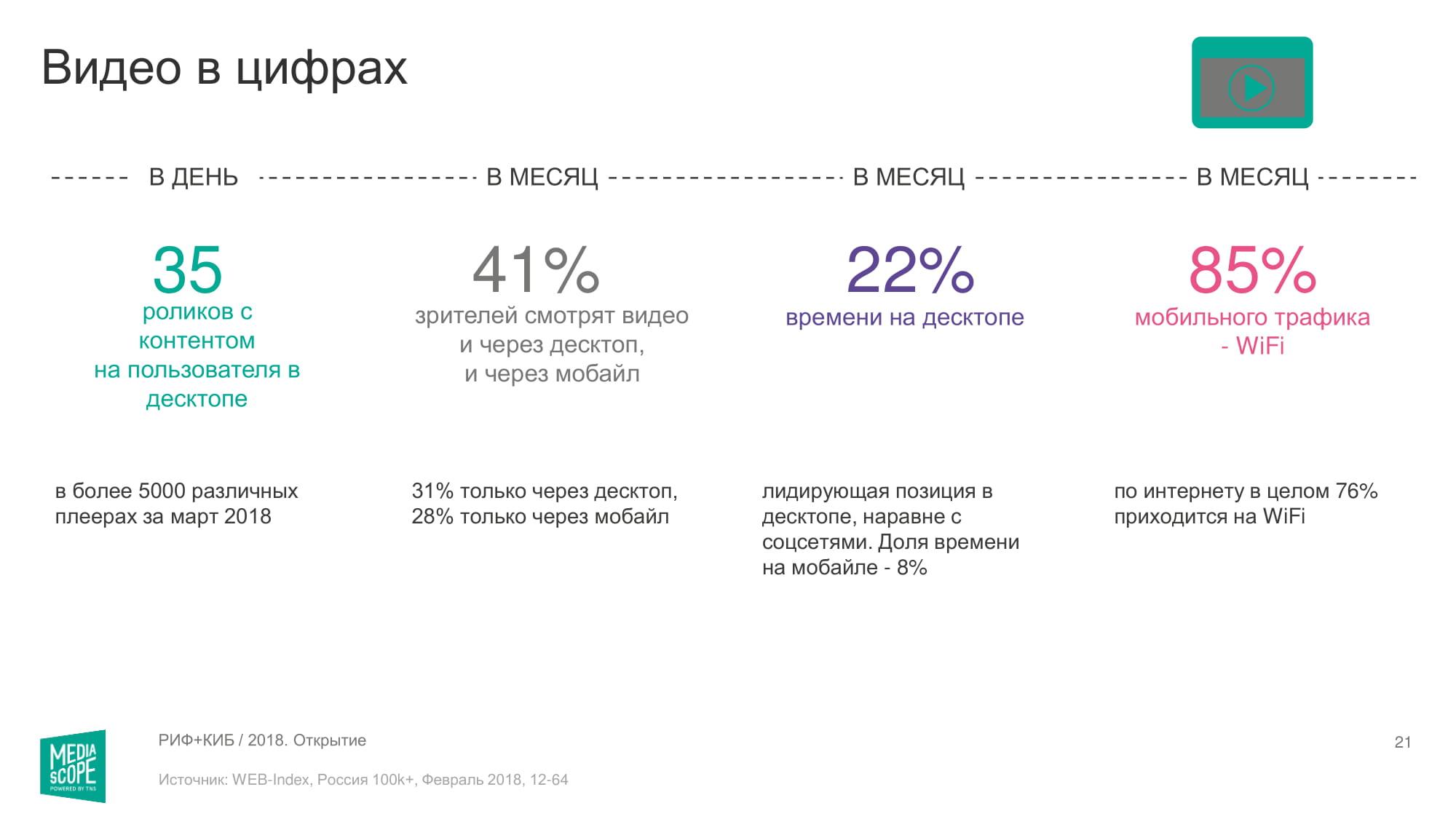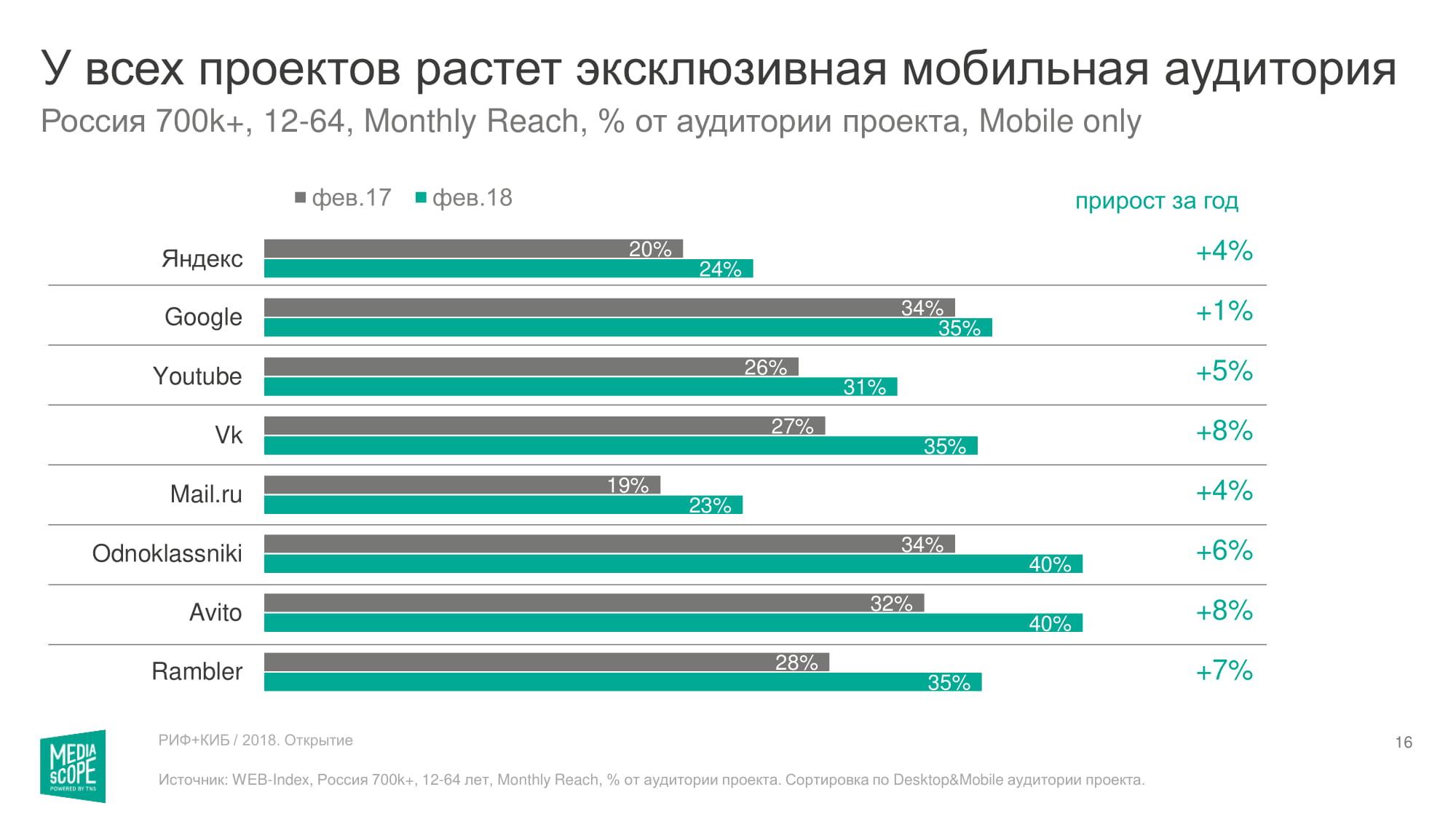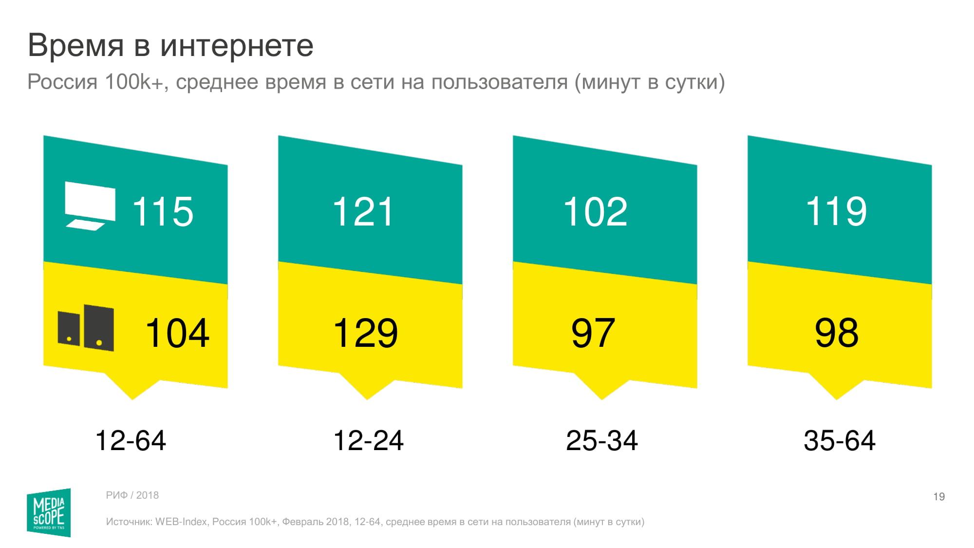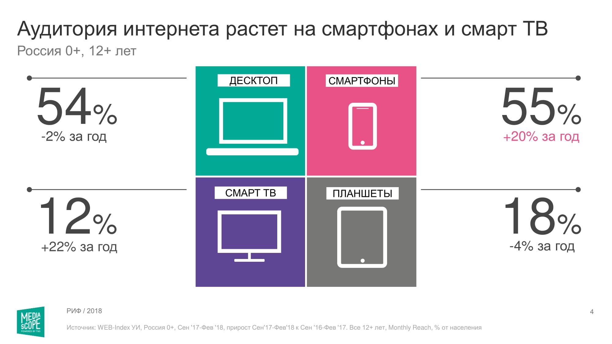 Исследовательская компания Mediascope на конференции РИФ 2018 рассказала об особенностях аудитории интернета, трендах в его потреблении, самых популярных ресурсах и с каких устройств их читают