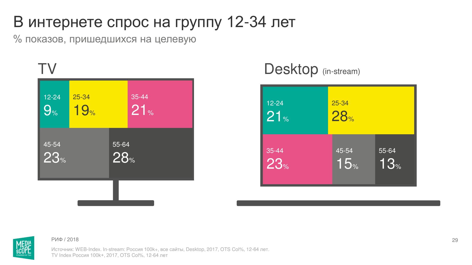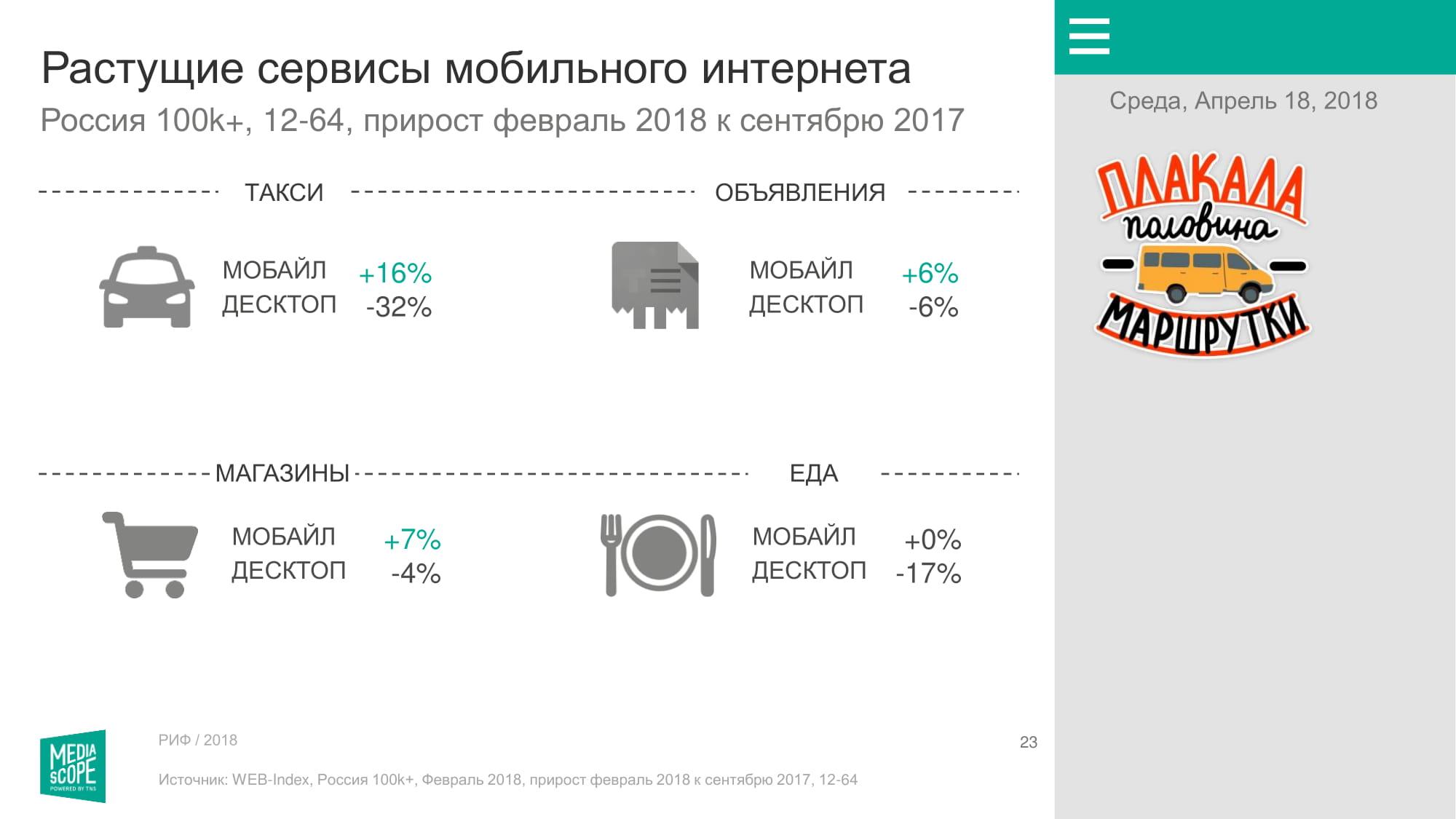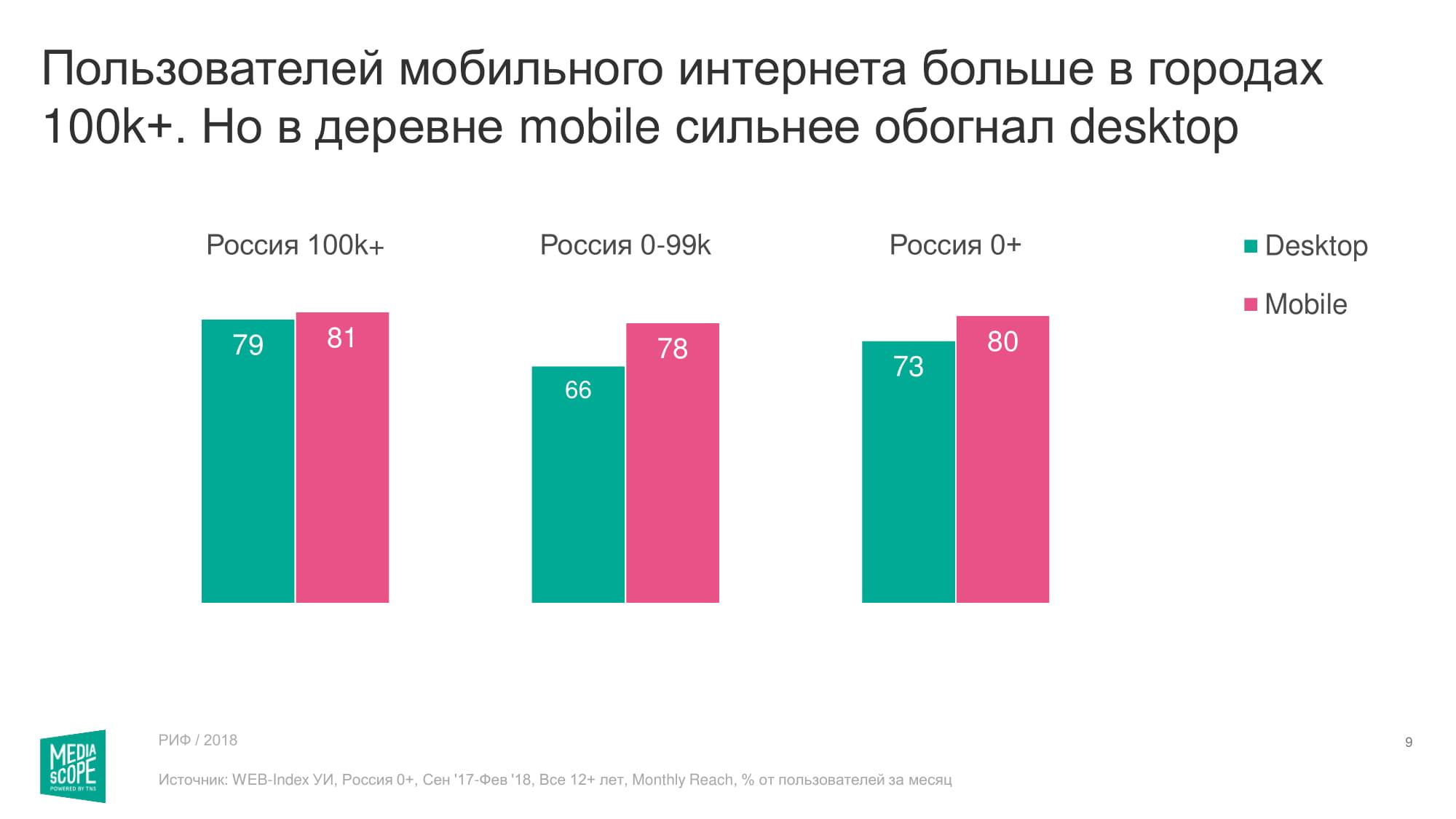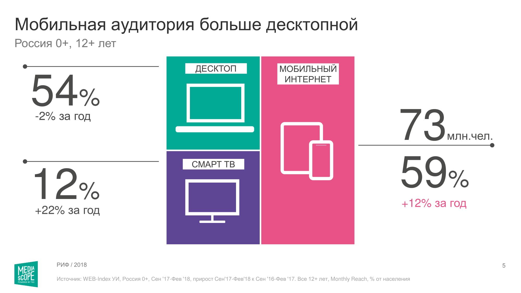Аудитория интернета на смартфонах за год выросла на 20%, 55% от населения 12+ лет – пользователи интернета именно на смартфоне. Также аудитория интернета выросла и на Смарт ТВ. Мобильная аудитория (смартфоны и планшеты) в целом опережает потребителей на десктопе (проникновение – 59%, 73 млн человек).