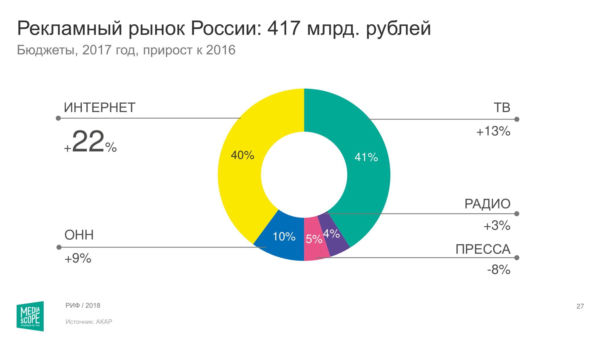Объем рекламного рынка России составляет 417 млрд руб. Самый большой прирост к 2016 г. – у интернета (22%).