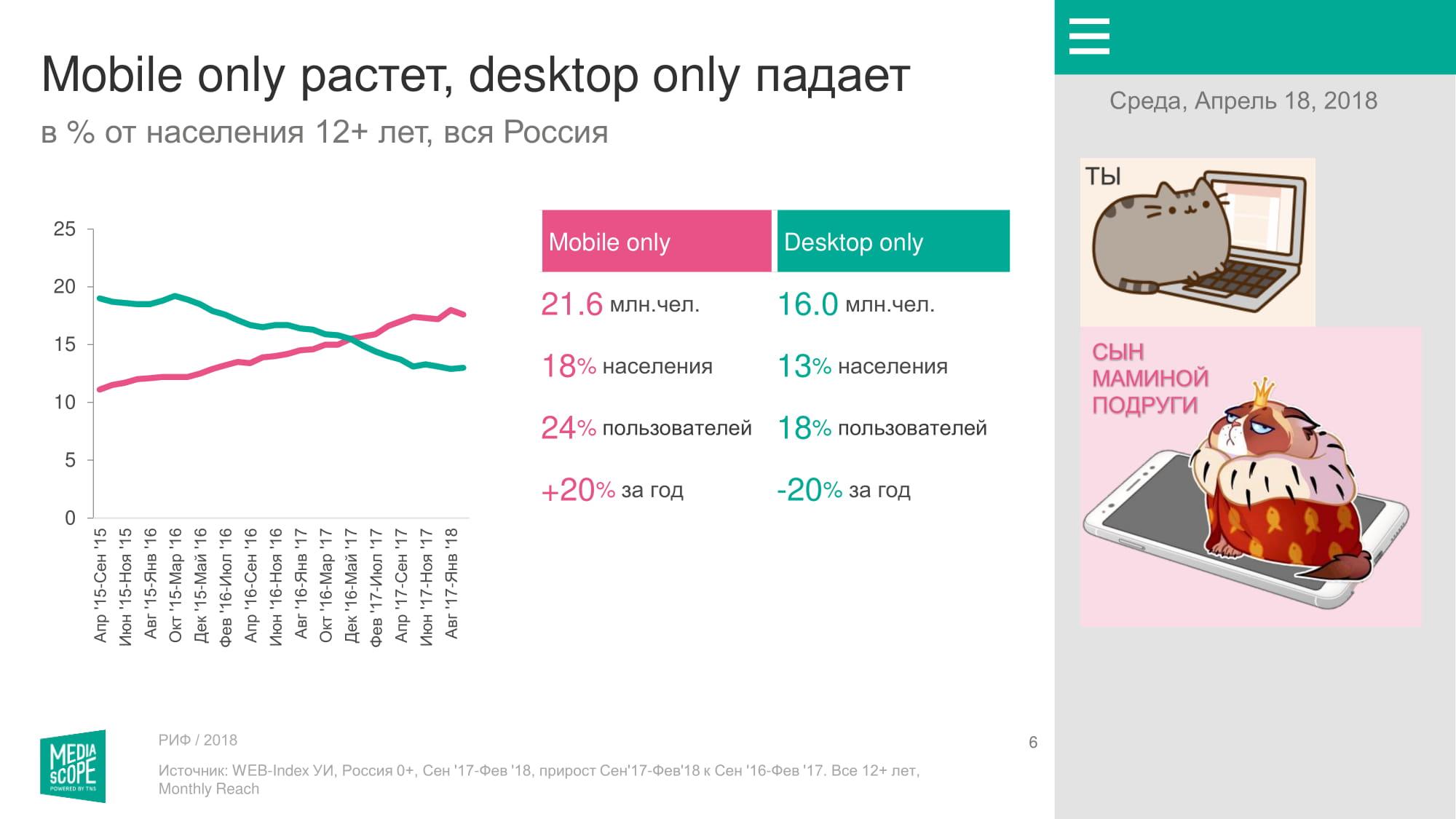 Только мобильным интернетом пользуются 21,6 млн человек, только десктопным – 16 млн человек.
