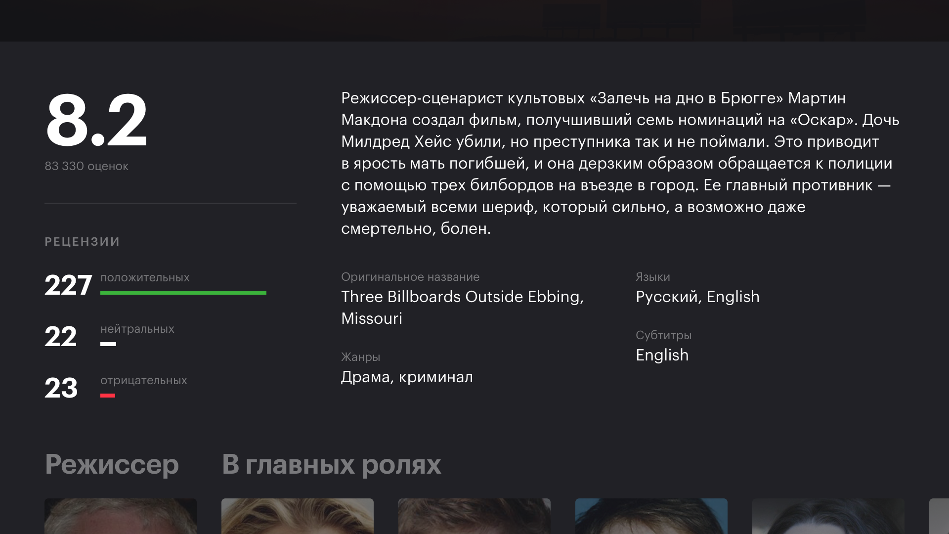 Сейчас в каталоге приложения более 1,5 тыс. фильмов для платного просмотра в Full HD, в их числе «Форма воды», «Темные времена», «Три билборда на границе Эббинга, Миссури».