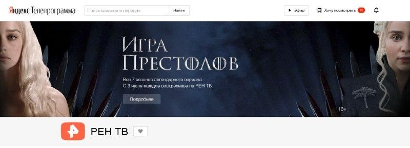 С 28 мая пользователи «Яндекса» могут увидеть рекламу «Игры престолов» от РЕН ТВ под поисковой строкой популярного сервиса. Таким образом РЕН ТВ поддерживает показ семи сезонов сериала, который начнется 3 июня.