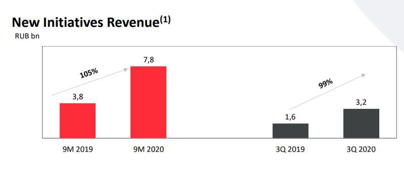 Cамым динамичным сегментом остаются «Новые инициативы», чей рост в третьем квартале составил 99%. Основной вклад в выручку данного направления (3,2 млрд руб.) внесли образовательные платформы (Skillbox и Geekbrains) и онлайн-классифайд «Юла». Доходы от EdTech превысили 1,6 млрд руб., по итогам года холдинг планирует довести этот показатель до 5 млрд руб.