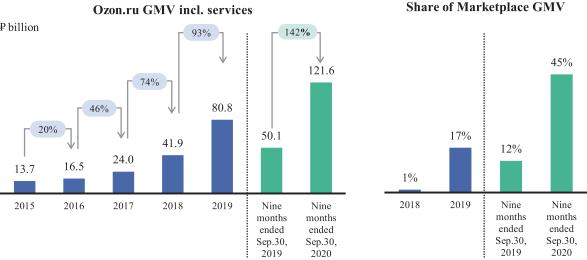 Расходы на продажи и маркетинг увеличились с 4,8 млрд руб. в январе — сентябре 2019 г. до 6,5 млрд руб. за аналогичный период 2020-го. Оборот (GMV) составил 121,6 млрд руб., причем на маркетплейс пришлось 45% валовых продаж. Годом ранее его доля составляла всего 12,4%.