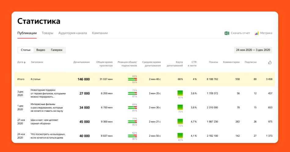 «Яндекс.Дзен» добавит в статистику каналов новую метрику — «Показатель реакции пользователей». Шкала реакций появится у материалов с более чем 1000 прочтений. Изучение реакций позволит блогерам оценить, насколько те или иные статьи понравились аудитории. В будущем эти данные будут доступны не только для статей, но и для других форматов, говорится в блоге сервиса.