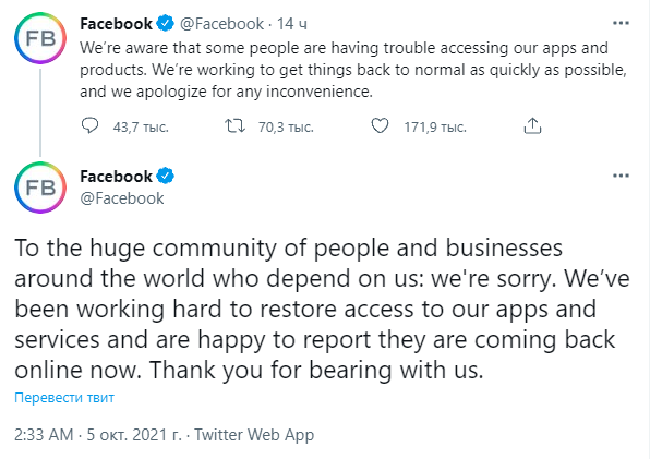 Команда Facebook и основатель компании Марк Цукерберг ужепринеслиизвинения за сбой.