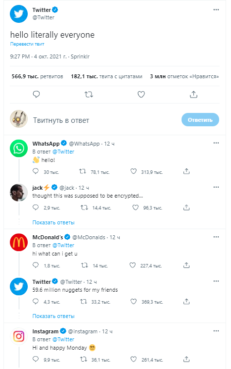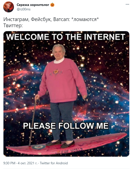 Поскольку неполадки привели к массовой миграции аудитории в другие сервисы,без злободневных шуток не обошлось.