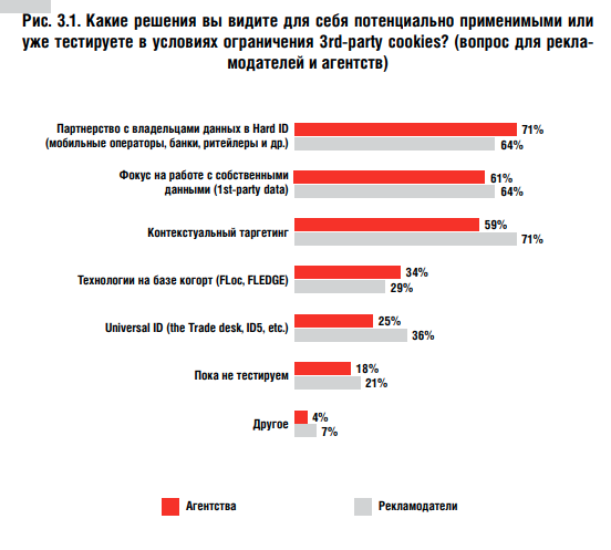 Для агентств наиболее перспективными cookieless-решениями являютсяпартнерства с владельцами данных в твердых идентификаторах — мобильнымиоператорами, банками, ретейлерами (71%), работа с собственными данными (61%) иконтекстуальный таргетинг (59%). У рекламодателей схожая картина, но для нихприоритетным направлением является контекстуальный таргетинг (71%), далееследуют партнерства и first party data (по 64%), говорится висследовании IABRussia.