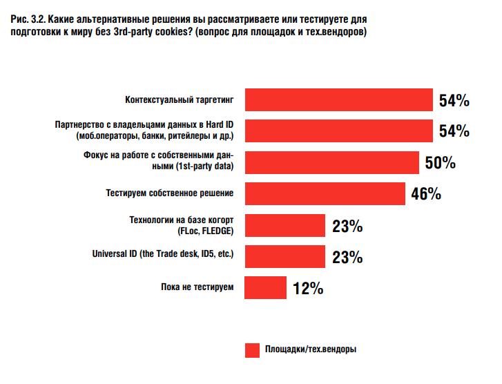 На стороне площадок и вендоров расклад похож на вышеприведенные цифры. Чащевсего назывались таргетинг по содержимому страницы и сотрудничество свладельцами данных Hard ID (по 54%), а также работа с собственными данными(50%). Однако значительная доля респондентов сообщила, что тестируетсобственное решение (46%). И только 12% предпочитают не суетиться.