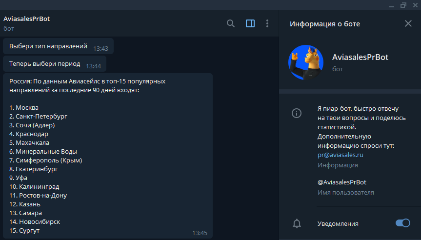 Pr-команда сервиса проанализировала журналистские запросы, чтобыотобрать самые популярные и интегрировать в новый сервис. Бот может рассказатьо самых востребованных направлениях для путешествий и о том, как за годизменились цены и спрос на авиабилеты.