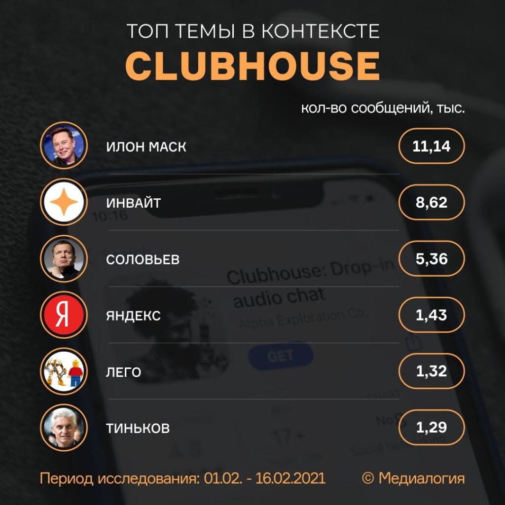 В России соцсетьвышла напервое место по количеству скачиваний уже в середине февраля. Илон Маск такжеусилил интерес россиян к платформе, пригласив президента страны ВладимираПутина на онлайн-встречу в Clubhouse. Этот инфоповод, по данным«Медиалогии», стал самым обсуждаемым в российских соцсетяхс 1 по 15 февраля в разрезе темы про Clubhouse. На второе место по обсуждению врунете вышли приглашения (инвайты), по которым можно зарегистрироваться всоцсети. Третье место заняла блокировка «комнаты» телеведущего ВладимираСоловьева, которая была закрыта на платформе сразу после анонса (аккаунттелеведущего не подвергся блокировке).
