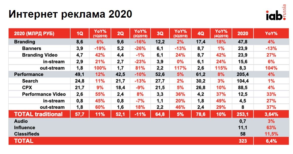 В 2020 г. бизнес потратил на интерактивную рекламу 323 млрд руб. без учетаНДС, что позволяет говорить о росте рынка digital на 6,4%. Оценка IAB Russiaвключает как классические форматы — Branding и Performance, так инетрадиционные направления — аудио, инфлюэнс-маркетинг и классифайды. Без нихобъем рынка составляет 253 млрд руб., что совпадает с ранее озвученнымицифрамиАКАР.