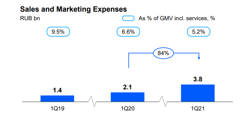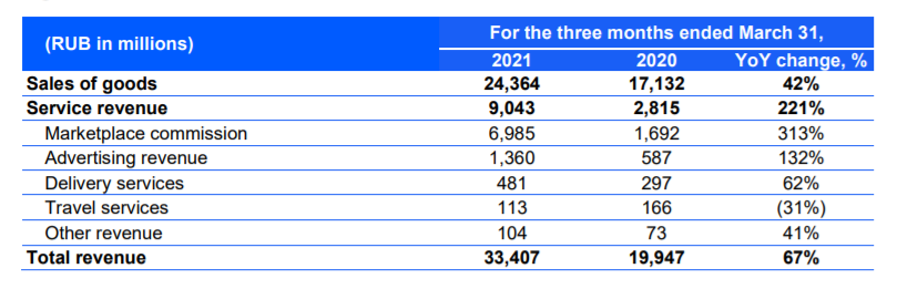 Общая сервисная выручка, куда входят услуги по продвижению, доходы отдоставки и комиссии для поставщиков, составила 9 млрд руб. (+221%), говорится вотчетности компании.