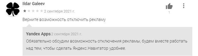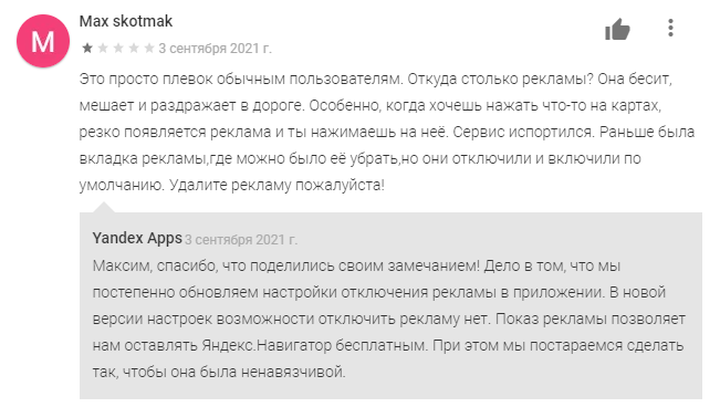 - «Откуда столько рекламы? Она бесит, мешает и раздражает в дороге. Особенно,когда хочешь нажать что-то на картах, резко появляется реклама и ты нажимаешьна нее»;