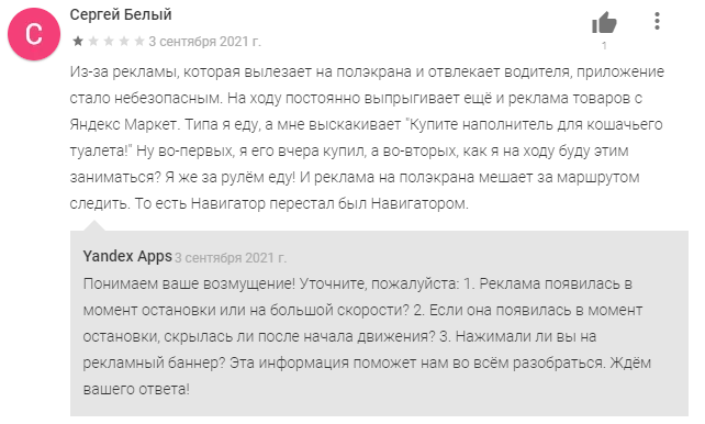 - «Из-за рекламы, которая вылезает на пол-экрана и отвлекает водителя,приложение стало небезопасным. На ходу постоянно выпрыгивает еще и рекламатоваров с “Яндекс Маркет”»;