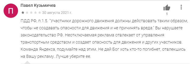 - «Неотключаемая реклама отвлекает от управления транспортным средством исоздает опасность для движения и других участников. Команда “Яндекса”,подумайте над этим. Не дай Бог хоть кто-то погибнет, отвлекшись на вашурекламу».