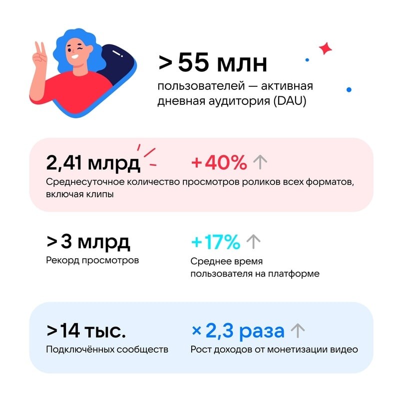 К программе видеомонетизации за год подключились более 14 тыс. сообществ, запоследний квартал их количество выросло на 300%. Также выплаты авторам видео запоследние полгода выросли более чем в 2,3 раза.