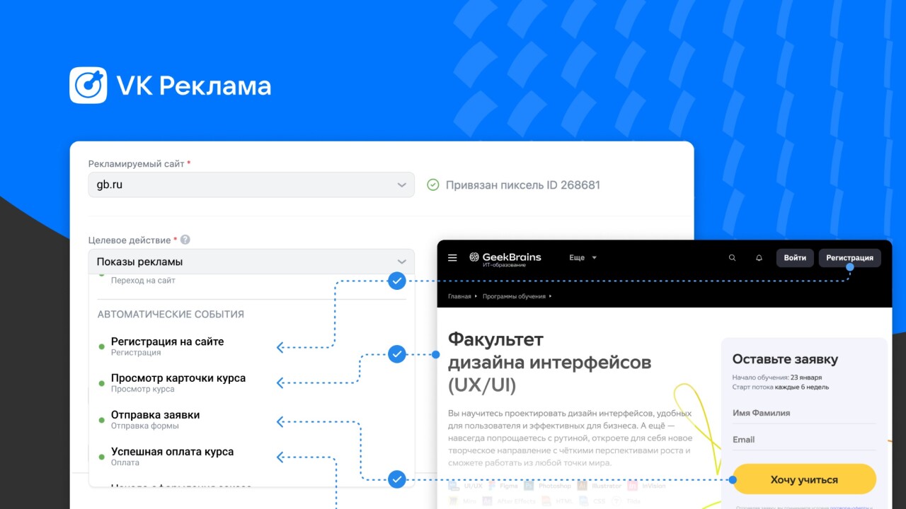 Если на сайте установлен пиксель «VK Рекламы», инструмент «Автоматическийпоиск событий» самостоятельно предложит актуальные цели продвижения. Например,просмотры карточек товаров, клики по номеру телефона, переход в мессенджер,добавление товаров в корзину или покупки. Алгоритмы распознают элементы кода насайте и проанализируют поведение аудитории на основе обезличенных данных.