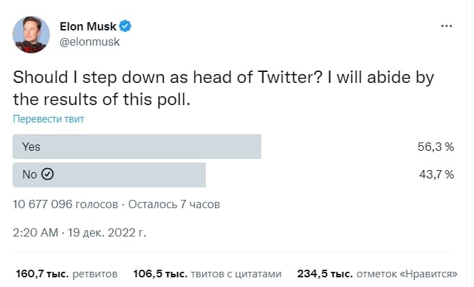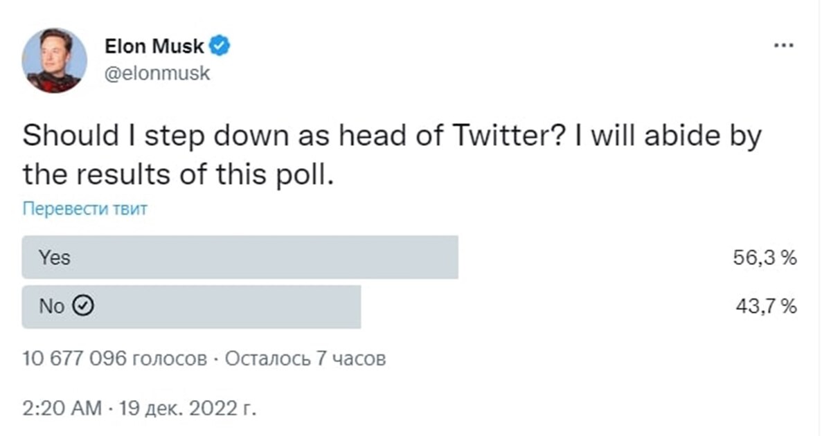 При этом Илон Маск опубликовалопрос, где спрашивает, нужно ли ему уйти с постаруководителя соцсети. Большинство пользователей ответили «да».