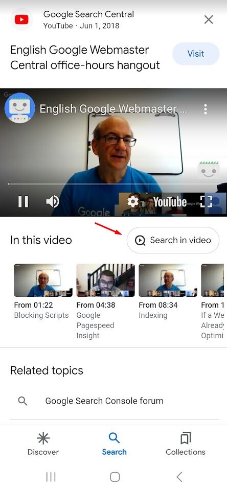 Гленн Гейб, президент G-Squared Interactive, обратил внимание на тест Googleв Соединенных Штатах. Онопубликовал скриншот в Twitter, который показывает, гдепоявился значок «Поиск по видео» на видеосервисе. Эта функция выделяетнеобходимый текст и временной код, чтобы перейти к нужному моменту ввидео.