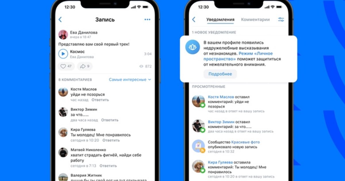 Режим «Личное пространство» позволит уменьшить нежелательное внимание.Нейросеть будет определять ругательства, оскорбления и другие негативныевысказывания в постах и комментариях. Как только что-то из этого будетобнаружено, искусственный интеллект предложит включить режим «Личноепространство». Алгоритм запускает механизм, если зафиксированы более трехнегативных комментариев или постов в течение часа.