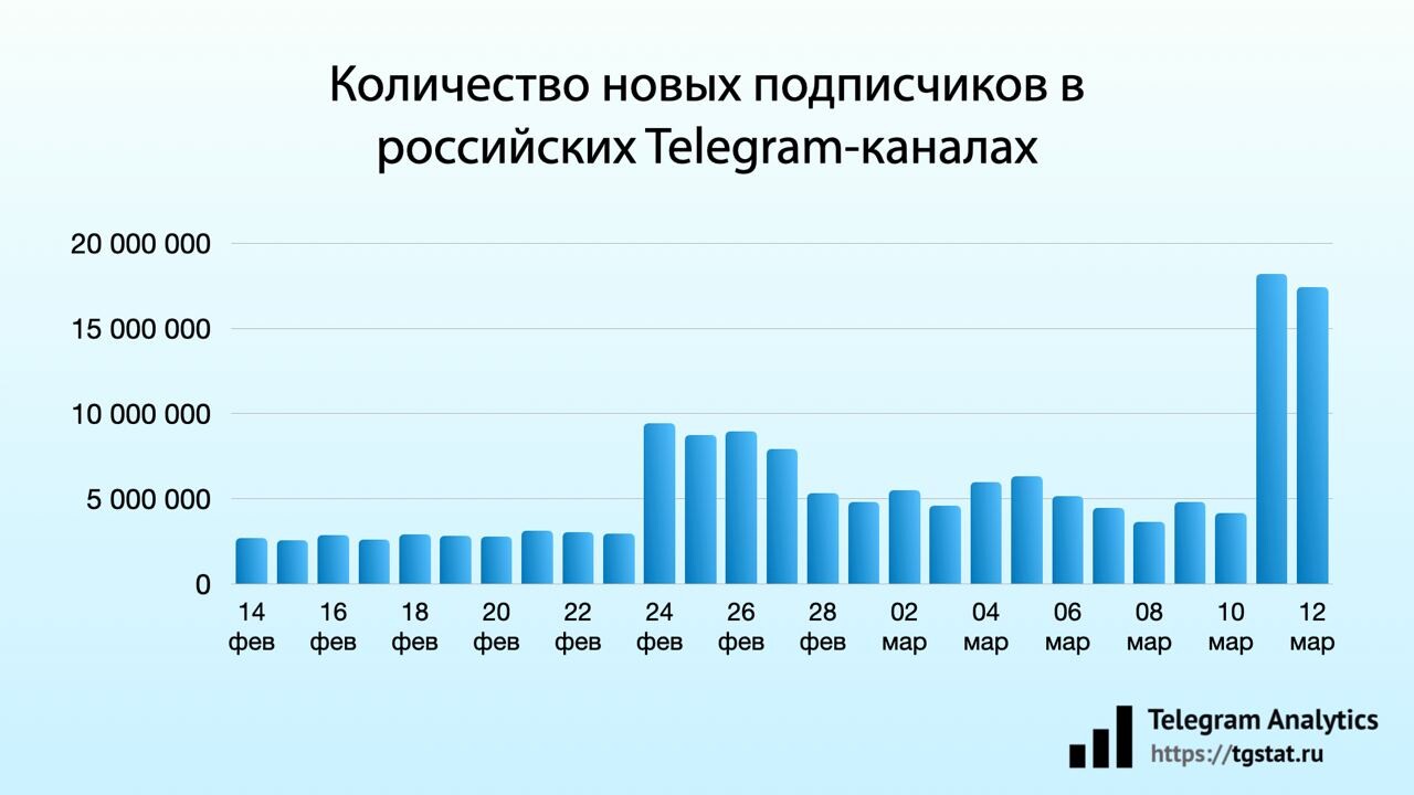 Количество новых подписок на Telegram-каналы превысило 40 млн послесообщения о блокировке Instagram, по даннымTGStat.ru.Роскомнадзор (РКН) начал блокировать соцсеть Instagram на территории России 14марта в полночь.