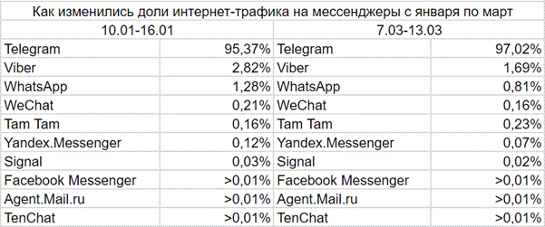 Лидером среди мессенджеров был и остается Telegram. На втором месте Viber,затем WhatsApp. За рассматриваемый период Telegram увеличил свою долю в общемтрафике на мессенджеры с 95,37% в январе до 97,02% в марте. Также свою долю втрафике увеличило и российское приложение Tam Tam — с 0,16% в январе до 0,23% вмарте. Остальные мессенджеры потеряли в доле общего трафика по сравнению сданными за январь.