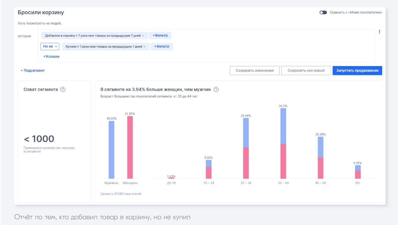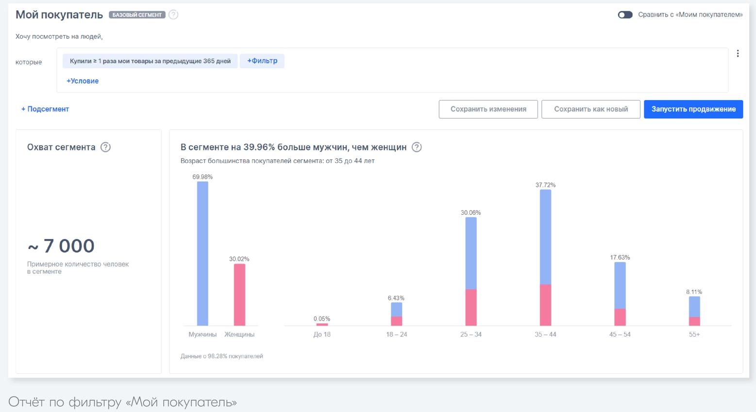 В отчете также доступны поведенческие фильтры, по которым можно разделитьаудиторию на тех, кто купил товар, посмотрел, добавил в корзину или визбранное. Для более детальной сегментации аудитории также можно указатьпериод, количество товаров и их категорию, с которыми взаимодействовалобезличенный покупатель. Вскоре эти данные можно будет использовать длятаргетирования рекламы внутри площадки. В конце весны с отчетом станутсовместимы два рекламных инструмента – «Баннерная реклама» и «Акция».