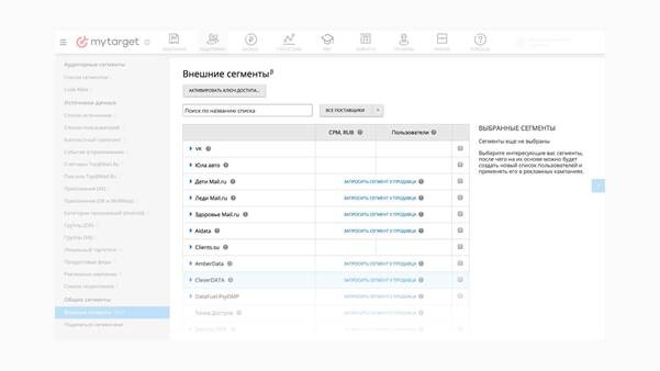 В рекламной платформе myTarget есть отдельный маркетплейс для таких внешнихсегментов (myTarget Data Marketplace). В нем рекламодатели могут напрямуюсвязаться с доступными партнерами и запросить кастомный сегмент для своихцелей. Цена использования сегмента устанавливается за тысячу показов (CPM) идобавляется к общей стоимости продвижения. Таким образом, за счет более точногопопадания в целевую аудиторию можно при меньшем охвате получить более высокиепоказатели конверсии и привлечь целевых для бизнеса покупателей.