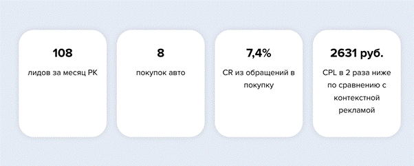Рекламные кампании с контекстным таргетингом позволяют получать целевые длябизнеса результаты даже в сложных товарных категориях. Например, за месяцпродвижения автомобилей в myTarget реклама с контекстным таргетингом принеслаавтодилеру 108 заявок, восемь из которых привели к покупке. А стоимость лида(CPL) оказалась в два раза ниже по сравнению с традиционной контекстнойрекламой.