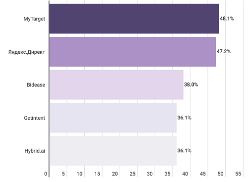На первом месте в рейтинге сотрудничества компания MyTarget, с которойработали почти половина фирм-респондентов. Второе место с очень небольшимотрывом у Яндекс. Директ. На третьем месте Bidease, четвертое поделили междусобой Getintent и Hybrid.ai - о факте сотрудничества с каждой из этих трехкомпаний упомянули более трети опрошенных клиентов.