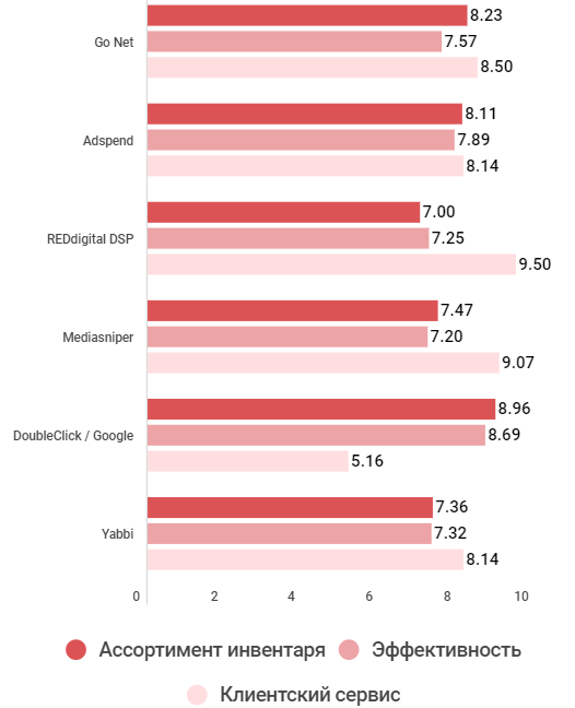 В рейтинге качества лидирует Go Net, на втором месте Adspend, у обеихкомпаний ровные достаточно высокие баллы по всем трем параметрам. Третье ичетвертое места у REDdigital DSP и Mediasniper соответственно. Эти два лидерасмогли набрать весомый общий балл за счет высокой оценки их клиентскогосервиса. Пятое место разделили DoubleClick / Google и Yabbi. Примечательно, чтоDoubleClick / Google уверенно обгоняет других участников рейтинга поассортименту и эффективности, но заказчики невысоко оценили клиентский сервискомпании, и она оказалась лишь на пятом месте.