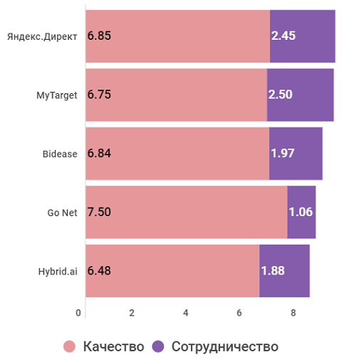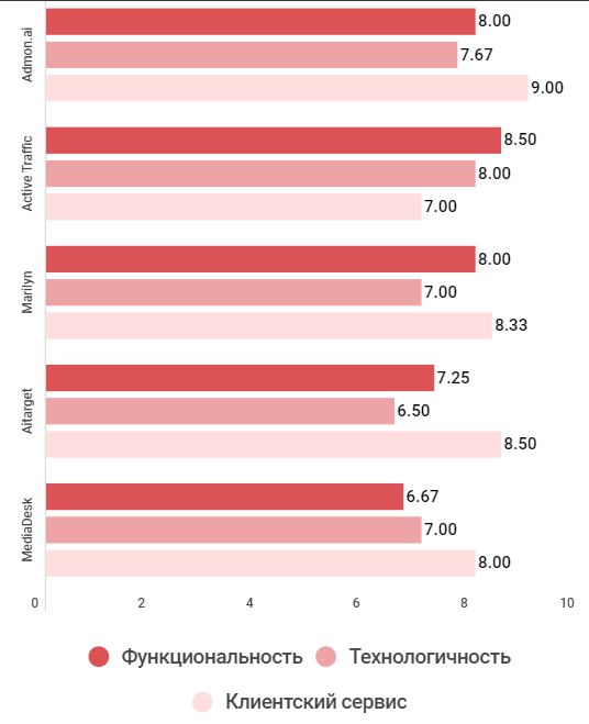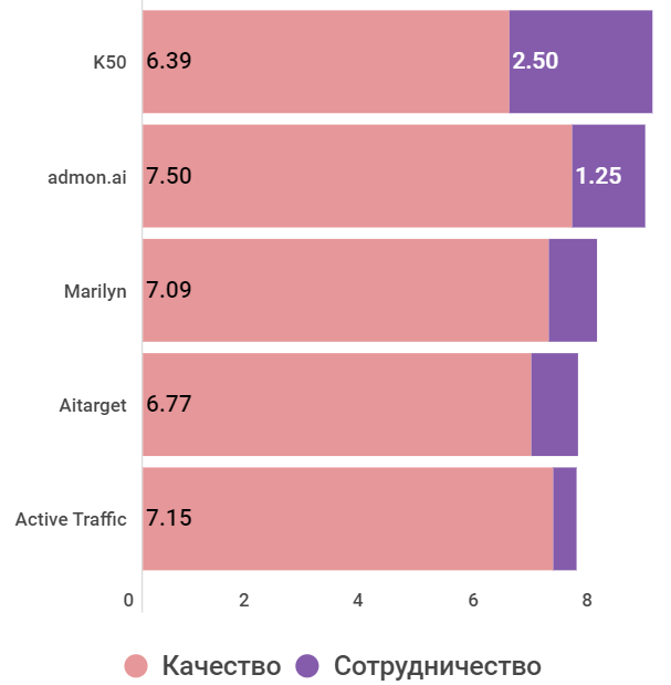 Лидирует в рейтинге качества Admon.ai, набравший большой средний балл засчет высокой оценки клиентского сервиса. Затем следует Active Traffic,завоевавшая второе место за счет функциональности. На третьем месте Marilyn сосредними показателями. На четвертом и пятом Aitarget и MediaDesk.