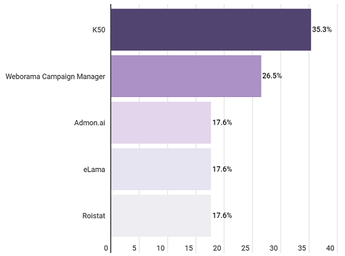 В рейтинге сотрудничества платформ для оптимизации на первом месте компанияK50, которую упомянули чуть более трети фирм-заказчиков. На втором местеWeborama Campaign Manager, с которой сотрудничали примерно четверть клиентов. Итретье место поделили между собой Admon.ai, eLama и Roistat. Нужно отметить,что сегмент специфический, и число набравших достаточное количество баллов дляпопадания в рейтинг компаний невелико.