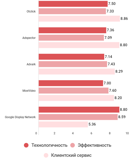 В рейтинге качества первое место досталось Otclick, затем следуют Adspector, Advark, MoeVideo и Google Display Network*. Все компании следуют друг за другом с очень небольшим отрывом. В основном качество работы у всех участников рейтинга невысоко, и попасть в ТОП-5 им удалось за счет высокой оценки клиентского сервиса. Исключение составляет Google Display Network, идущая далеко впереди всех по показателям эффективности и технологичности, но значительно проигрывающая за счет уровня клиентского сервиса и в итоге оказавшаяся лишь на пятом месте.