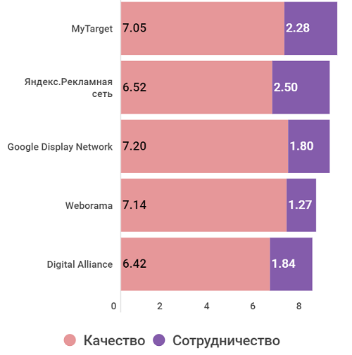 В интегральном рейтинге лидирует MyTarget, далее с небольшим отрывом почти вровень идут Яндекс.Рекламная сеть и Google Display Network*. На четвертом и пятом местах соответственно Weborama и Digital Alliance - их оценка отстает от лидера примерно на один пункт. Примечательно, что качество услуг заказчики оценивают невысоко, и попасть в ТОП-5 лидерам удалось за счет хороших показателей сотрудничества.
