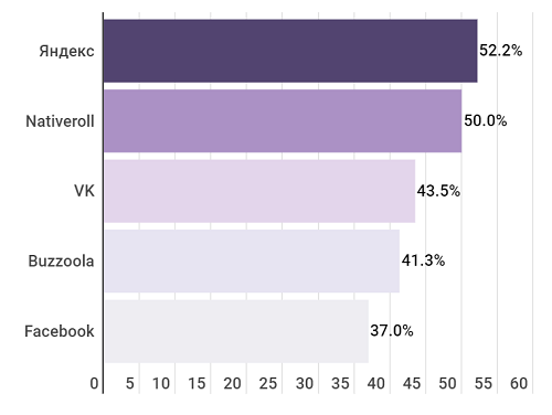 Среди сетей нативной видеорекламы на первом месте Яндекс, с ним работали чуть более половины компаний. На второй позиции Nativeroll, отстающий очень ненамного. VK и Buzzoola набрали меньше на 6-9 процентных пунктов и занимают соответственно третье и четвертое места. Пятое место поделили сразу три компании - Facebook**, Getintent и Instagram**, получившие на примерно 15% меньше лидера.