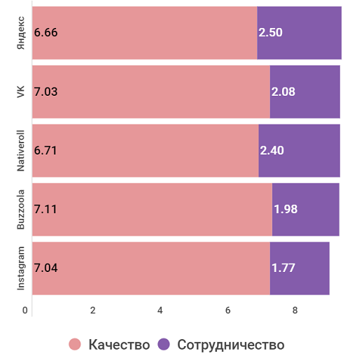 Лидирующий в интегральном рейтинге Яндекс сумел победить исключительно за счет большого клиентского портфеля - оценка за качество у него самая низкая из всех попавших в ТОП-5 компаний. Схожая картина у Nativeroll (3 место). Самая высокая оценка за качество у Buzzoola, но сотрудничают с этой компанией не так много клиентов, поэтому она заняла лишь четвертое место.