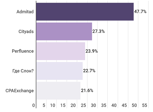 В этом сегменте даже в ТОП-5 компаний заметна низкая доля сотрудничества. Лишь лидера Admitad упомянули примерно половина фирм-заказчиков. Cityads, занявший второе место, набрал почти вполовину меньше, с ним работали менее трети клиентов. Доля сотрудничества у Perfluence и Где Слон? (3-4 места) не дотягивает до четверти опрошенных, а поделившие пятое место CPA Exchange и Flocktory назвали примерно пятая часть респондентов.
